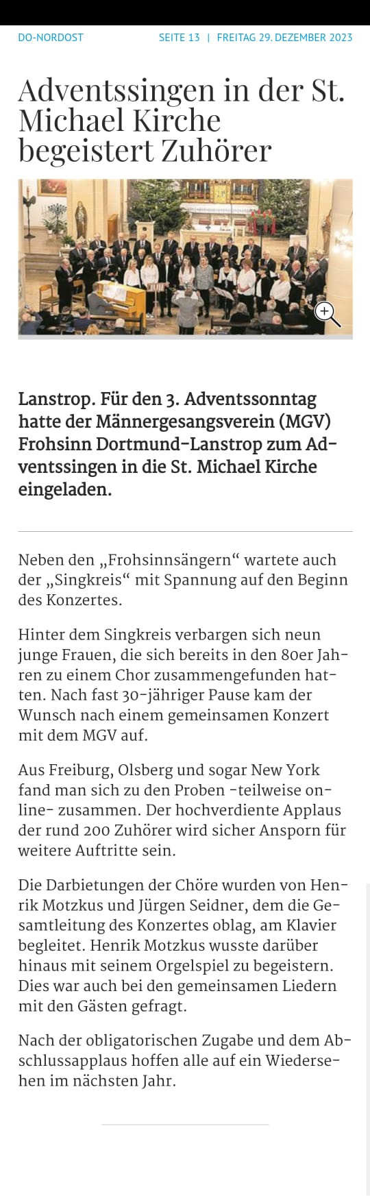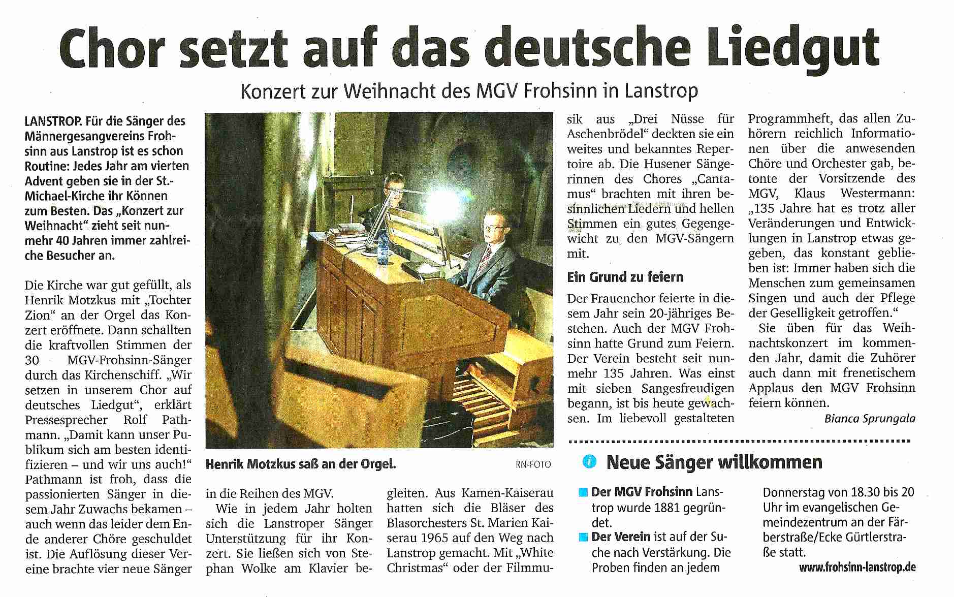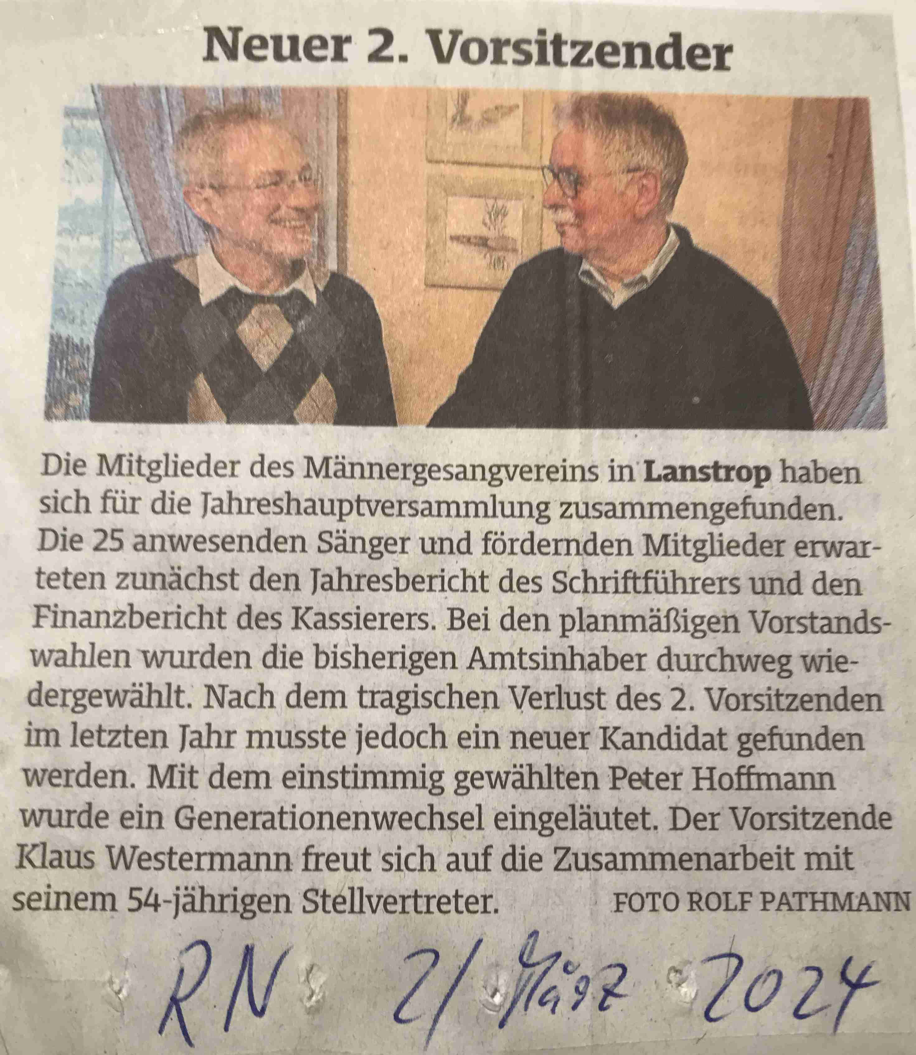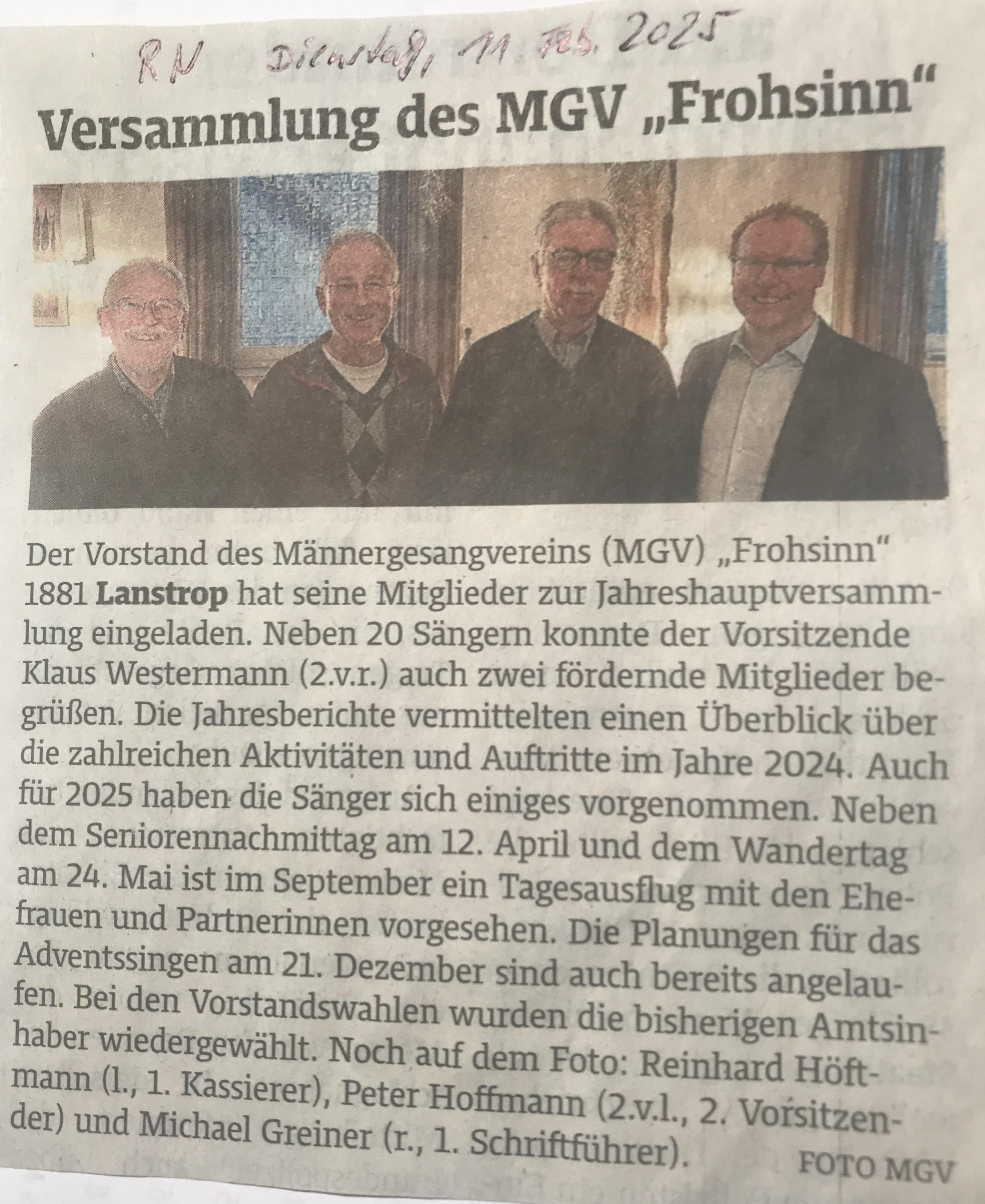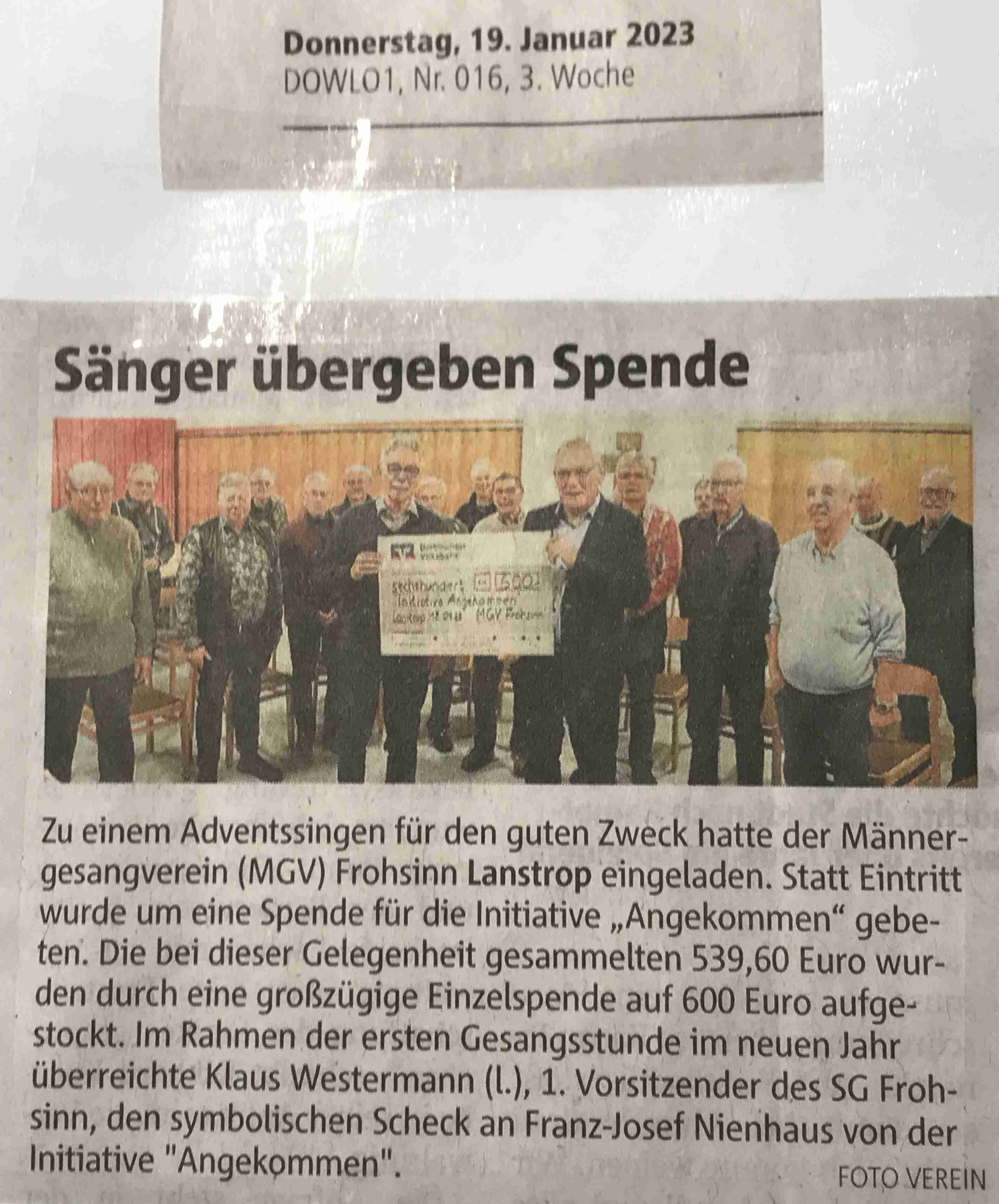 Auf der diesjährigen Hauptversammlung des MGV "Frohsinn" am Samstag, 13. Feb. wurden an die Flüchtlingshilfe im Ortsteil Dortmund-Lanstrop 500,00 Euro überreicht.
